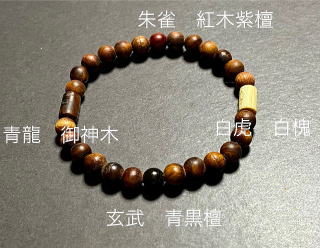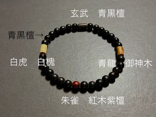 東の青龍(ご神木)、西の白虎(白槐)南の朱雀(紅木紫檀)北の玄武(青黒檀)